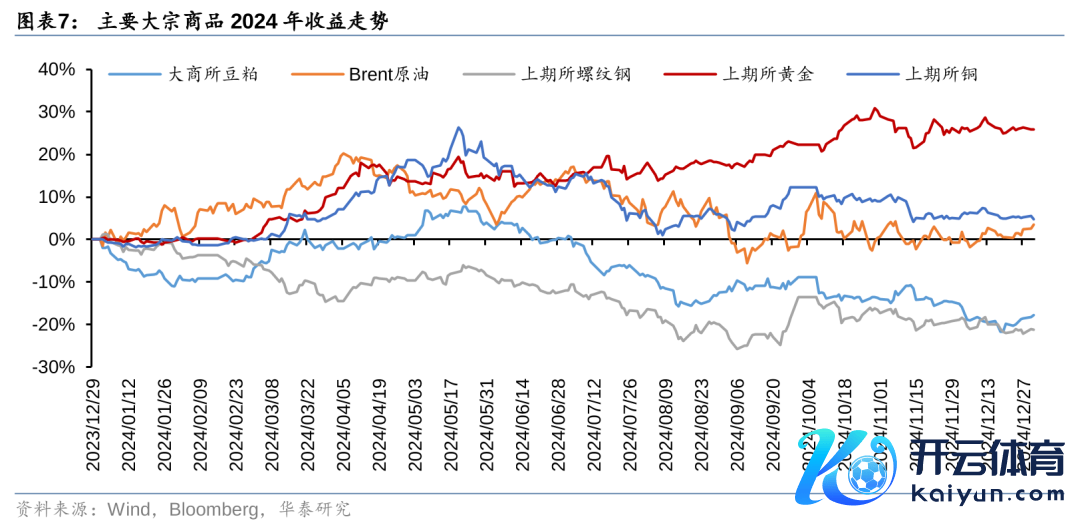 大批商品中,除黄金全年线路较强以外,其余主要大批商品均呈现前高后低的特征。黄金由于受到好意思国降息预期、地缘政事打破、人人央行购金等影响,全年线路王人较为强势,最大回撤仅7.13%。一季度在人人需求预期较为乐不雅的情况下,原油、铜均有较强线路,然而5月份之后人人需求预期有所修正,商品价钱握续着落,四季度参预颠簸博弈口头。