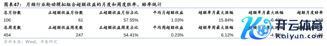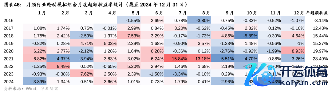 下列图表统计了月频行业轮动模拟组合的月度逾额收益及胜率赔率。完了表现,模拟组合12月相平等权基准逾额收益-0.78%,2024年逾额收益-5.52%;2016-04-30至2024-12-31时间,月度胜率约为57.55%,月度赔率约为1.69。