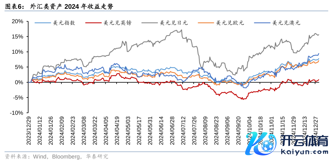 2024年主要外汇线路:日元上半年握续贬值,其余货币相对好意思元保管颠簸,在日本加息激勉阛阓震动之后,8月至9月日元增值、好意思元指数有所走弱,然而跟着好意思联储加息落地、好意思国大选有关交游兴起,好意思元指数握续走强,好意思元指数全年高涨7.80%。