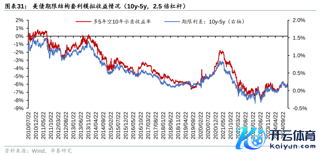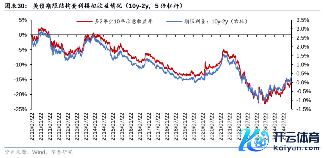 所谓期限利差套利策略,是指通过作念多某个期现的国债期货、作念空另一个期现的国债期货来获取不同期限利差变化的收益。关于现在阛阓,对利率进行主见性判断的难度可能要大于对利差进行判断。期现倒挂完了之后,期限利差八成率会出现上行,策略胜率较高。具体操作上,10年期好意思国国债期货久期梗概是2年期国债期货久期的4倍傍边,是5年期国债期货的1.5倍傍边。因此不错构建多4倍2年期国债期货空1倍10年期国债期货、多1.5倍5年期国债期货空1倍10年期国债的套利组合,划分套取10y-2y利差上行收益和10y-5y利差上行收益。