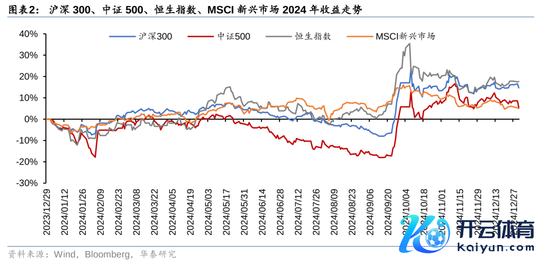 中国股票阛阓在2024年的收益主要来源于9月底和10月初。年头由于小盘股着落带动阛阓调遣,2月份之后阛阓徐徐设立,5月份至8月份阛阓堕入阴跌,9月份政事局会议之后,阛阓交游柔软开释,股票阛阓出现较大高涨,沪深300全年高涨14.68%,恒生指数高涨17.67%。MSCI新兴阛阓走势与中国股票阛阓走势肖似。