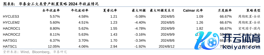 2024年,华泰金工研发的人人配置策略HATSG1、HYCLES3、HYCLEM2全年收益划分为6.37%、5.57%、5.60%,国内钞票配置策略HATSC1、HACROC1、HACROC2全年收益划分为12.05%、8.80%、8.11%。