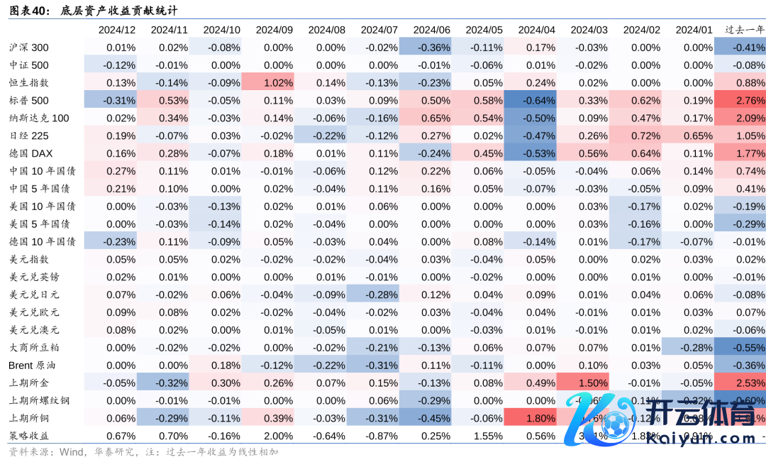 在股票、债券、外汇、商品四类主要大类钞票中,股票类钞票线路最佳,其中好意思股、德股、日股、港股均有较好线路,仅法国CAC40全年录得负收益。2024年全年收益率最高的子类钞票是黄金,上期所黄金全年收益25.89%,其次是好意思股,纳斯达克100和标普500划分高涨24.88%和23.31%。之后是日经225、德国DAX、恒生指数等。从夏普比来看,2024年线路最佳的子类钞票秩序为中国10年债、上期所黄金、中国5年债、标普500和德国DAX。全年回撤最小的两个钞票是中国5年债和中国10年债,回撤最大的三个钞票是大商所豆粕、上期所螺纹钢和日经225。月度胜率最高的钞票则是中国5年债、德国DAX、标普500和纳斯达克100。